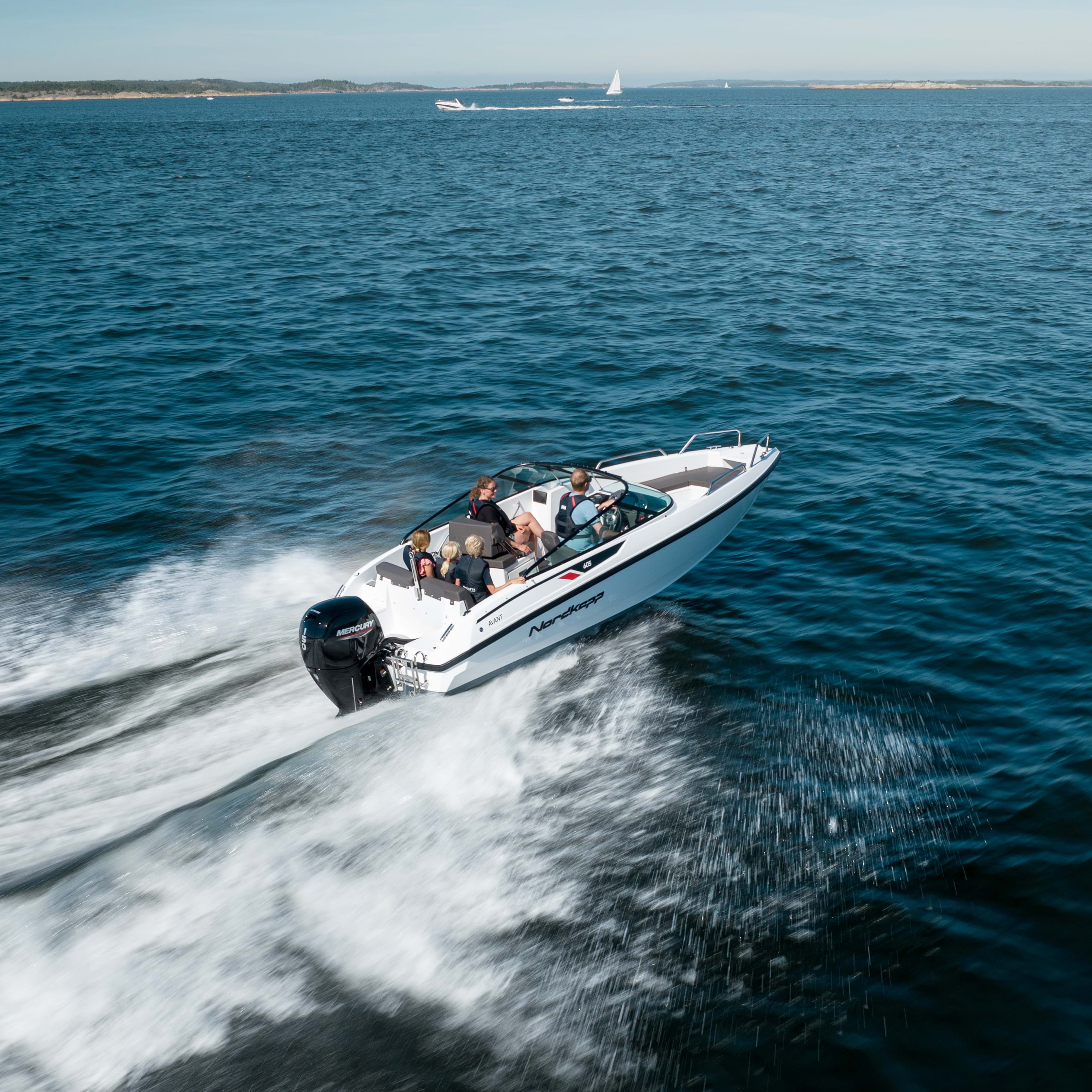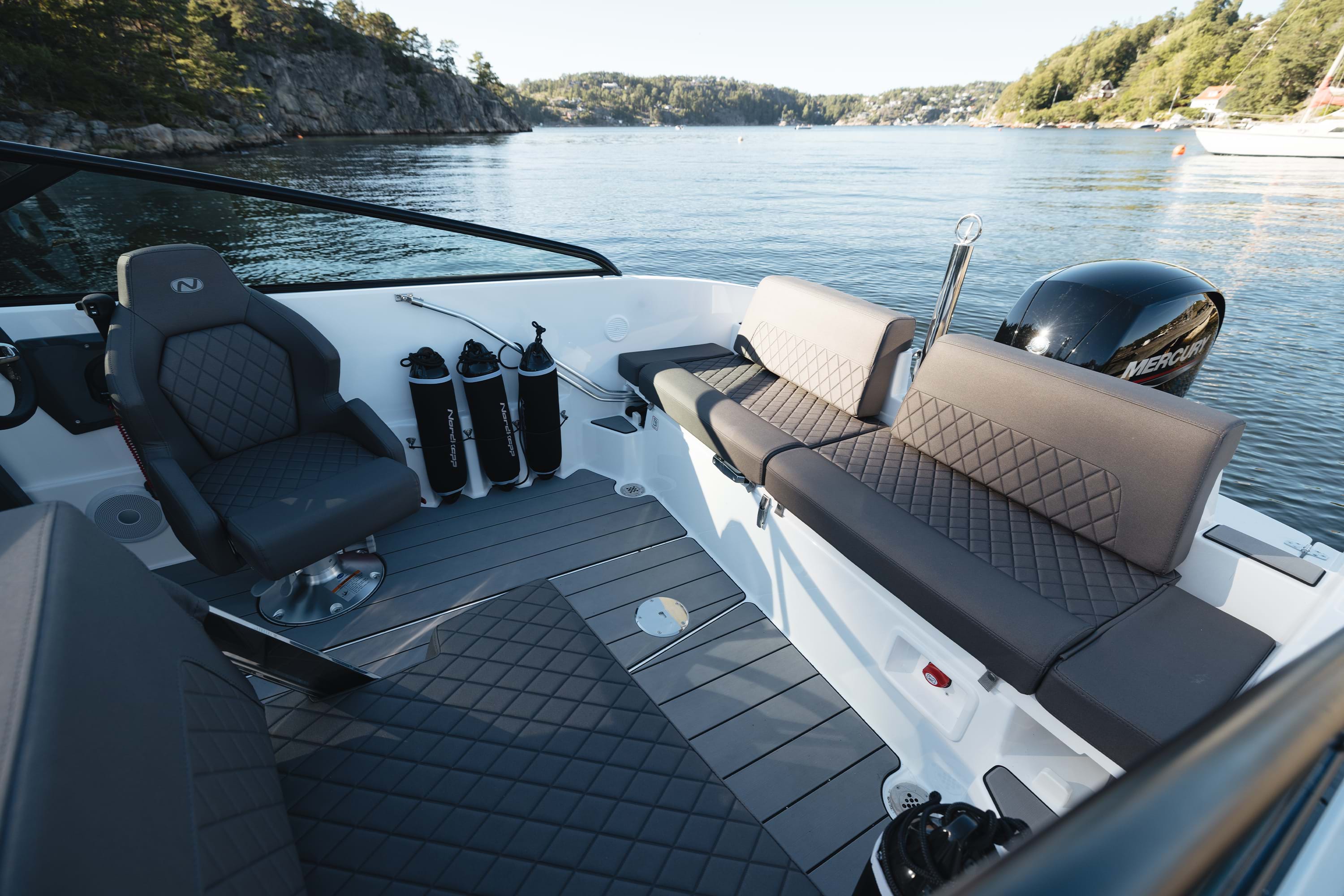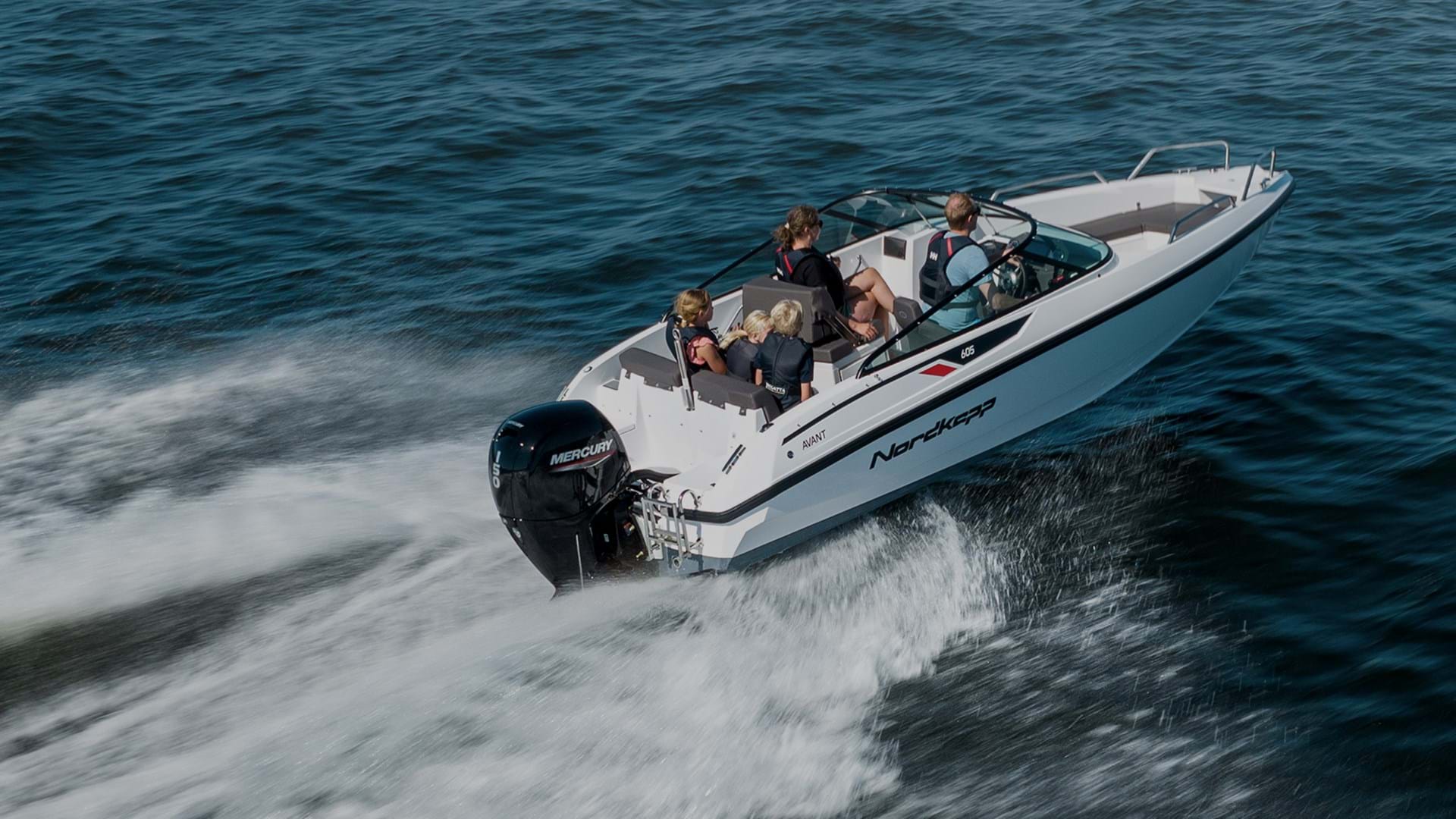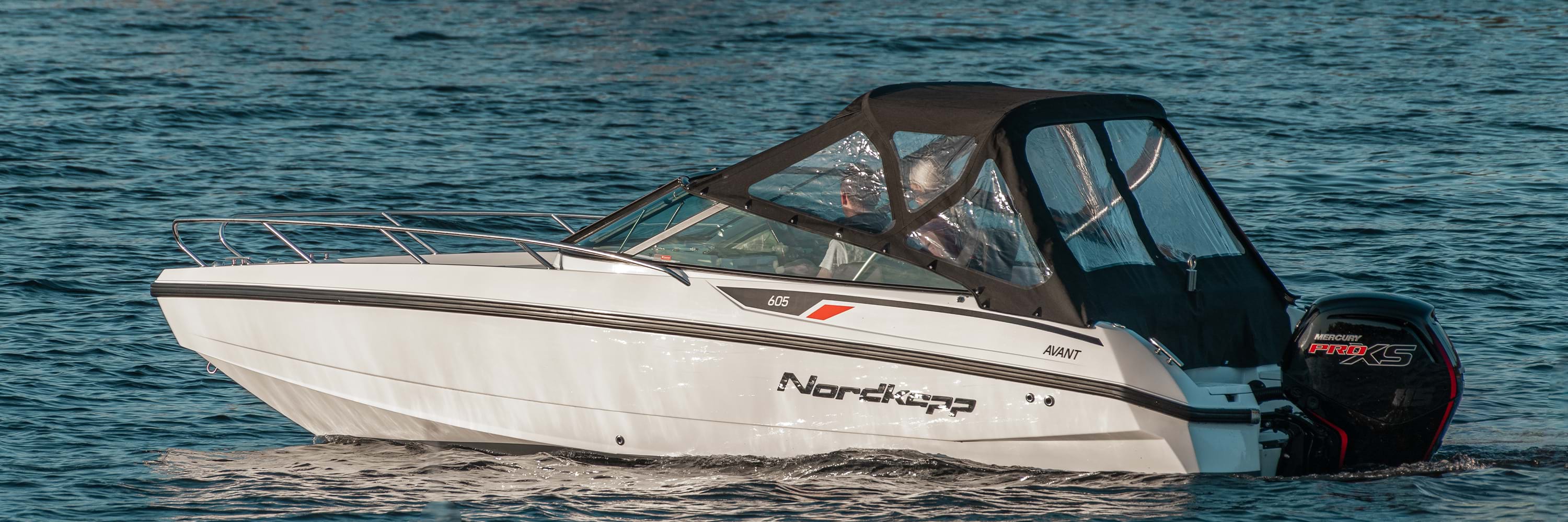 Den skarpe V-bunnen på Avant 605 gir sportslige kjøreegenskaper og komfortabel gange når du kjører rolig eller i sakte fart. Høyt fribord og det bredere baugdesignet gir enkel adgang om bord samtidig som alle sitter trygt og godt i båten. Kombinasjonen med Mercurys stillegående motorer gjør alle deler av kjøringen med Avant 605 til en sann glede.