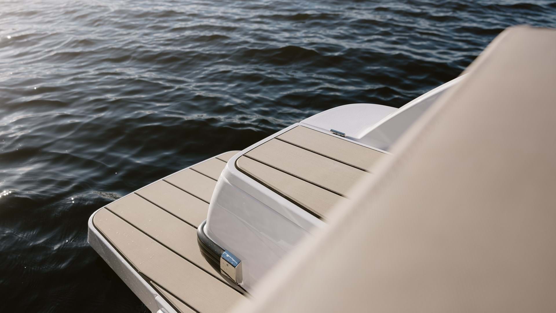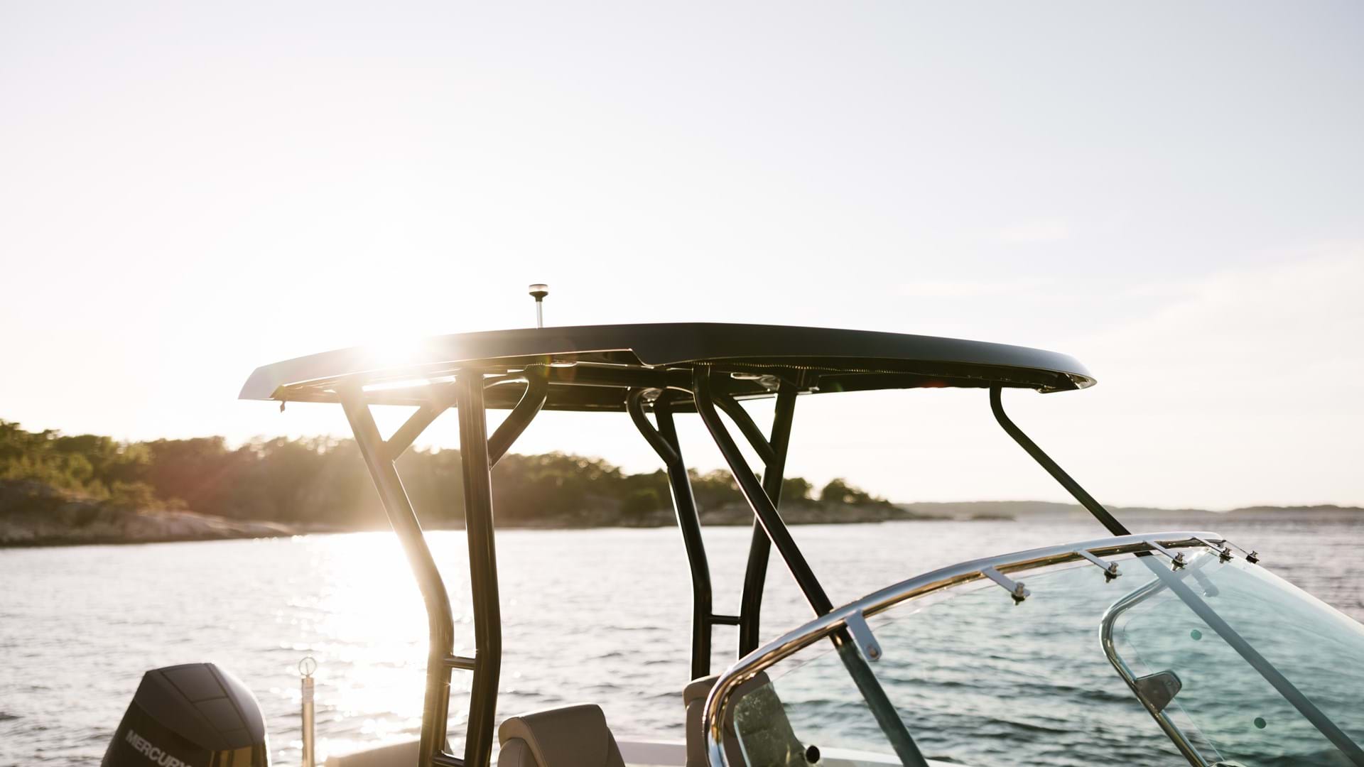 Small but significant details—like cut-outs in the stylish freeboard windows that double as steps—highlight the boat's purposeful design. The sturdy and sleek T-top roof enhances the aesthetic appeal and provides comfortable shade on sunny days.