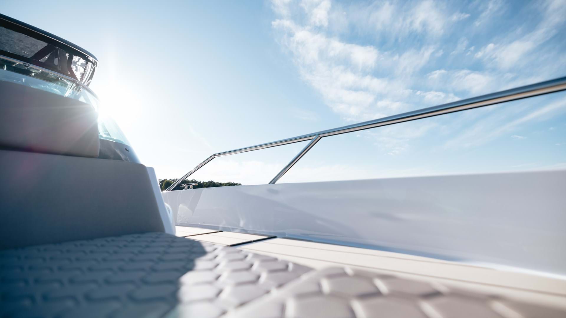 Starting at the bow, you'll find elegance perfectly paired with comfort. A spacious sunbed for two invites you to unwind and enjoy the water, even when moving, as the wind soars effortlessly above. Cup holders on both sides ensure your favourite drink is always within reach. Robust construction and sturdy railings along the bow provide a safe and stable environment, allowing you to manoeuvre with confidence. An accessible anchor hatch completes this thoughtfully designed area.