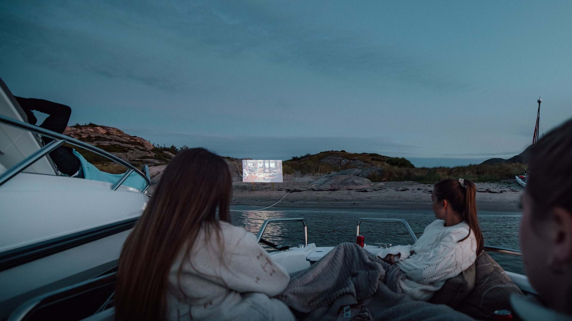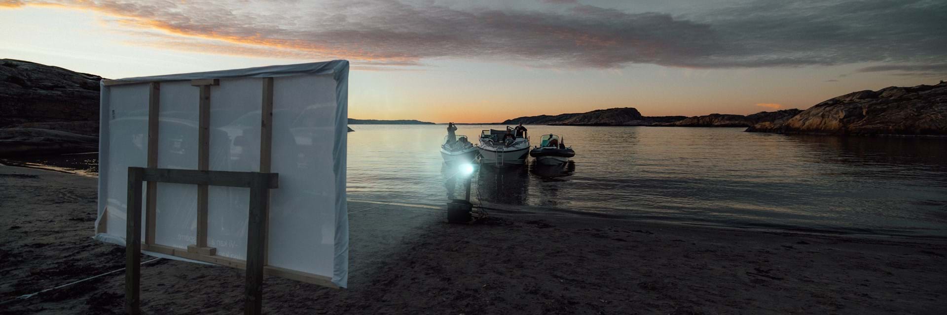 Patrik built a frame for the outdoor cinema with a friend, found a suitable projector, and bought a large white sheet. After inviting a few friends to join, including Nordkapp's brand ambassador Jelly, they set off to their destination in the archipelago.