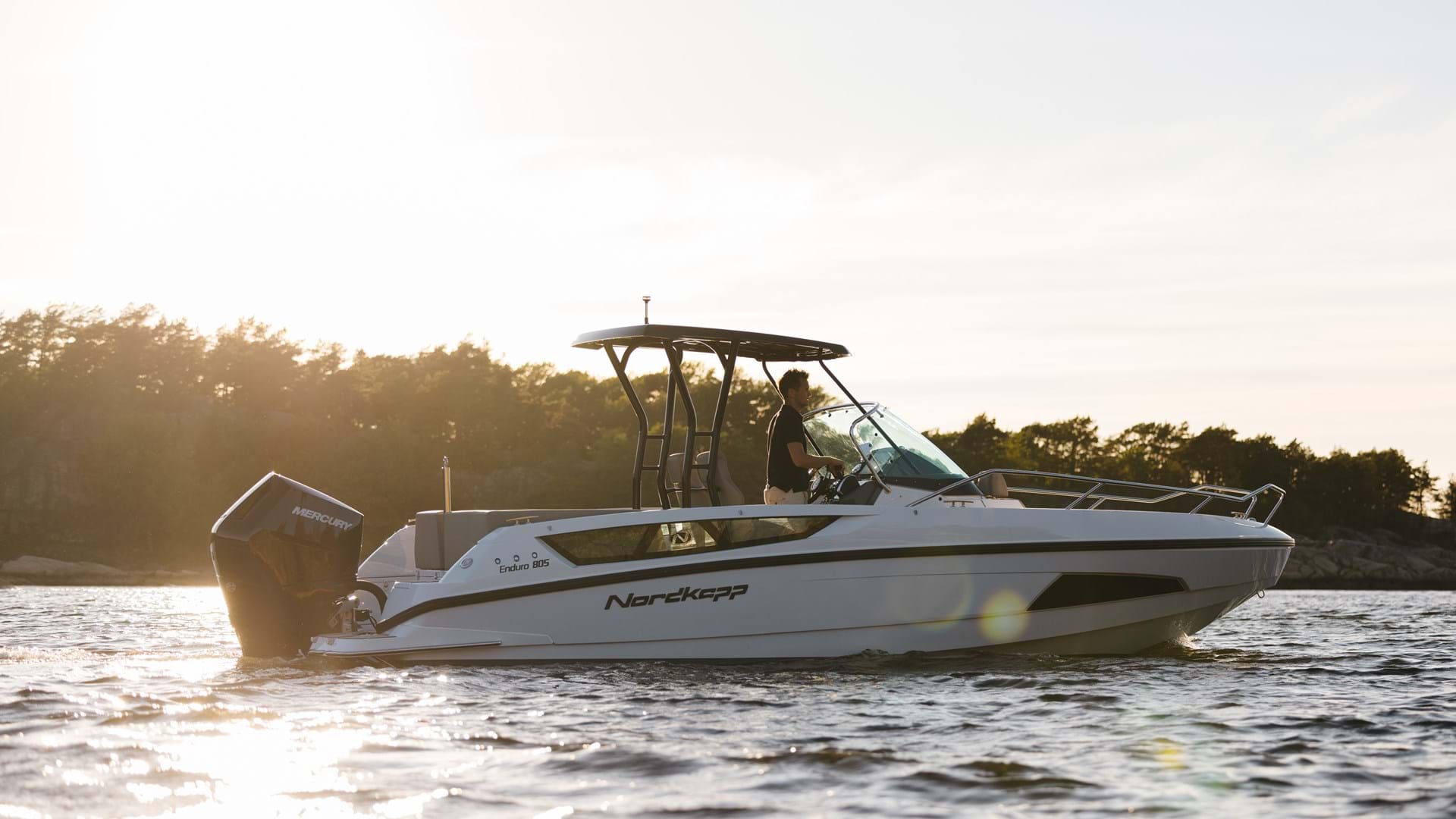 Morgen blir til dag, og solen varmer omgivelsene etterhvert som den stiger på himmelen. Ombord i Enduro 805 T-top sitter man komfortabelt i le fra solen med en forfriskende bris som passerer gjennom båten. Her kunne man vært hele dagen.