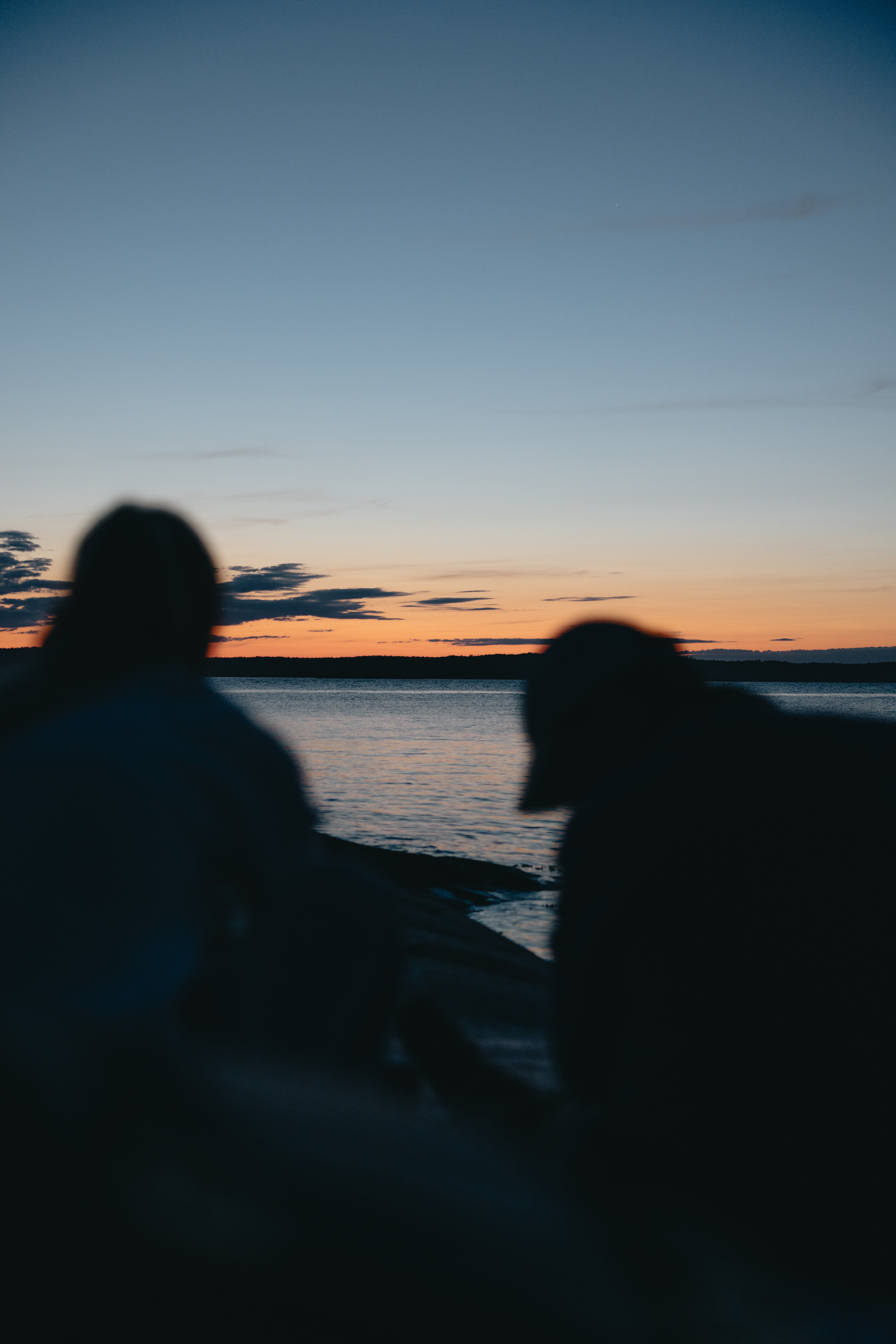 Etter en stund hørte vi lyder litt lenger oppe på stranden. Da vi nærmet oss, ble de merkelige lydene til latter og sangglede. Til vår glede oppdaget vi at øya hadde sin egen midtsommerfest på gang. Kledd i tradisjonelle drakter og med blomster i håret, danset folk rundt midtsommerstangen (eller Midsommarstång som det kalles i Sverige) mens de feiret sommersolverv med glede og energi. Vi satt på stranden, nøt drikkene våre og omfavnet det unike teateret som ble fremført for oss denne varme sommernatten. Da dansen begynte og den høylytte sangen "Helan går" runget ut over havet, bestemte vi oss for å dra tilbake til leiren - akkurat i tide for solnedgangen.