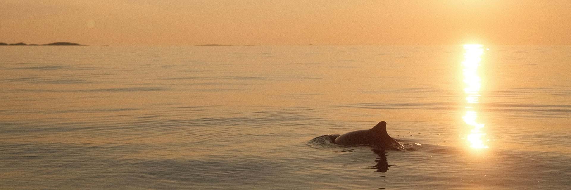 Halvveis over kryssingen oppdaget vi bevegelse på styrbord side. Først én nise, så en liten stim – fem eller seks – som gled rett under overflaten. Vi dro ned på farten og lot båten legge seg til ro. Etter et minutt var de rundt oss, lekne og nysgjerrige, rett under vannskorpen. Motoren var stille, og tiden virket å stå stille med den.