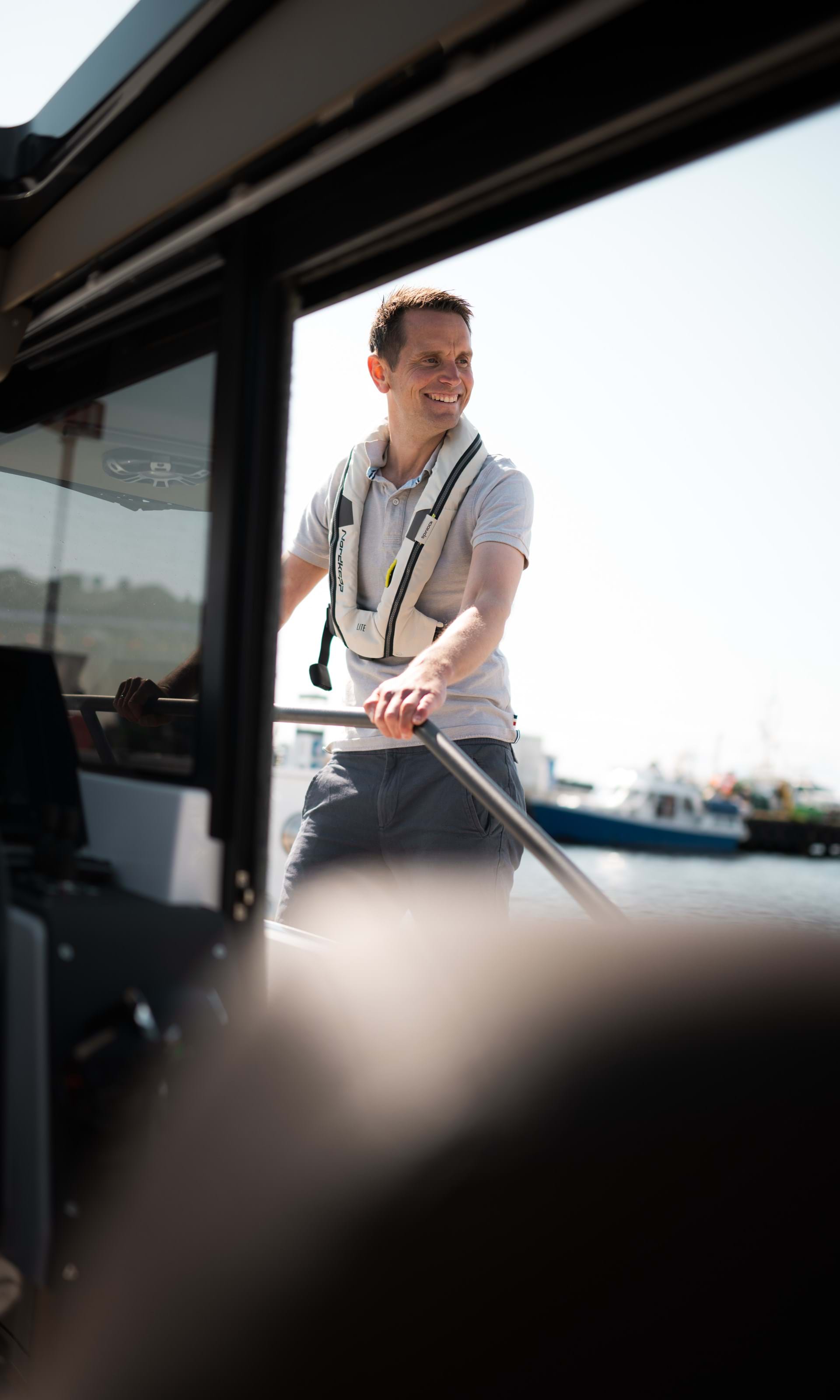 Neste morgen møttes vi ved marinaen innerst i Skjebergkilen – vårt faste utgangspunkt. Lufta var skarp, men S-deck’et var lunt under føttene. Fredrik gikk om bord og smilte. «Det føles som jeg fortsatt står på brygga,» sa han, med et blikk mot skrogets stabilitet.