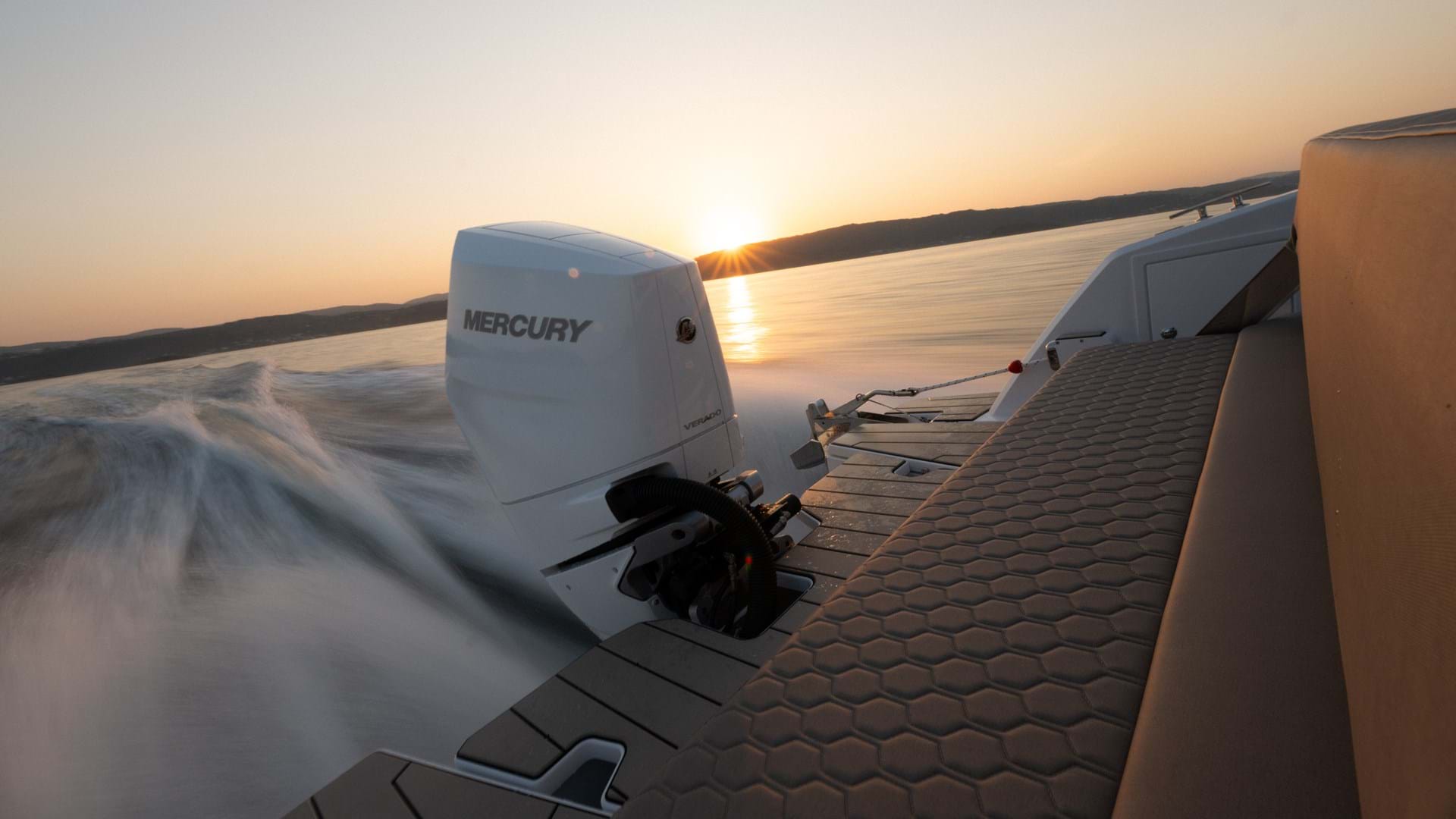 Etter det livlige lydbildet under oppstarten av Mercurymotoren gir den 350 hk sterke Mercury Verado V10-motoren en rolig reise – noe man virkelig setter pris på i en styrhusbåt. Selv på korte turer som denne merkes forskjellen.