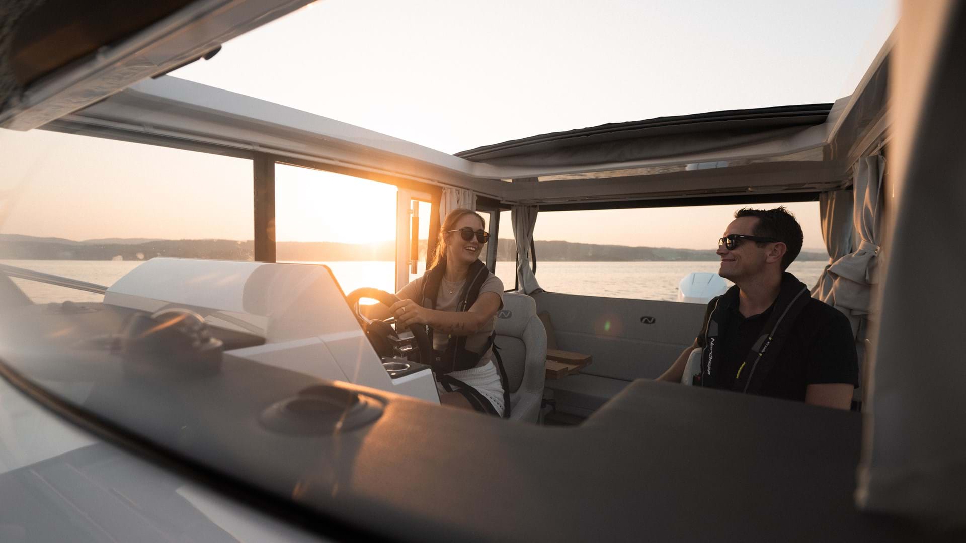 Det hadde vært en lang dag, og vi ble sittende lenger enn planlagt. Men følelsen av å komme seg ut på sjøen var for fristende til å la være. Vi bestemte oss på impuls – en liten kveldstur med Coupe 830. Etter hvert som solen nærmet seg horisonten, satte vi kurs mot brygga – jeg, Maja og fotografen vår, Teodor.